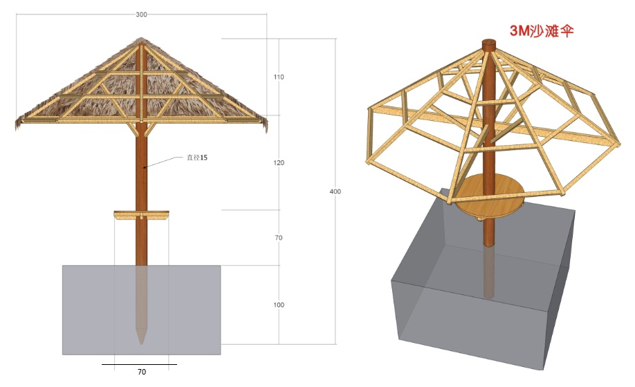 檐口直徑:300cm;立柱直徑:15cm;傘面材料:科佰所有型號草型均可應用;傘架結構:防腐木質 或 鋼結構;可根據客戶需求設計定做特殊尺寸規格造型。